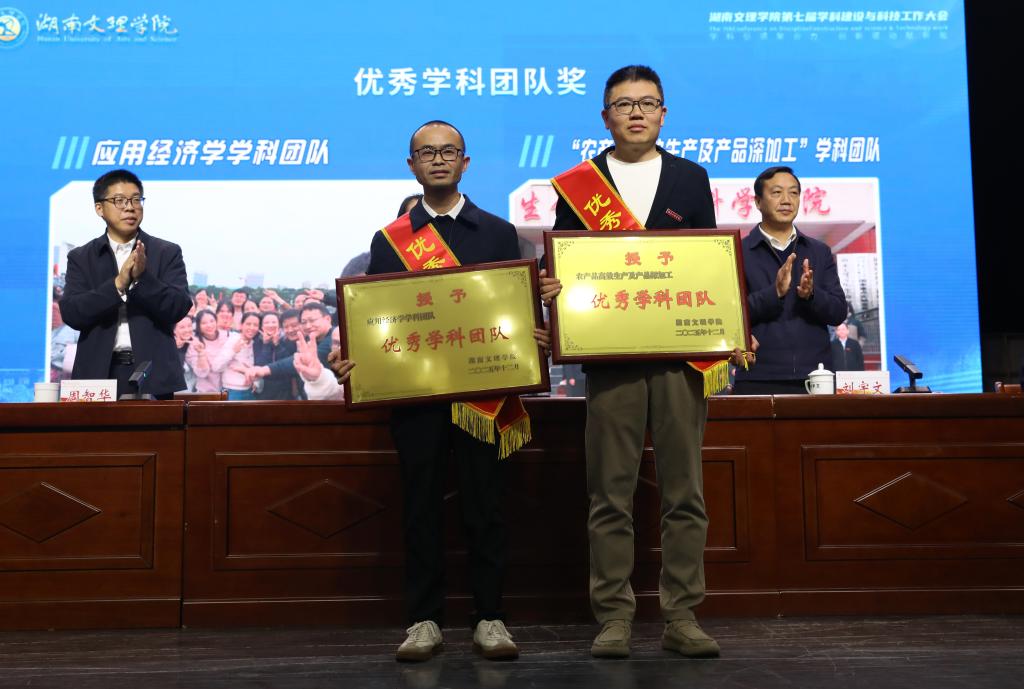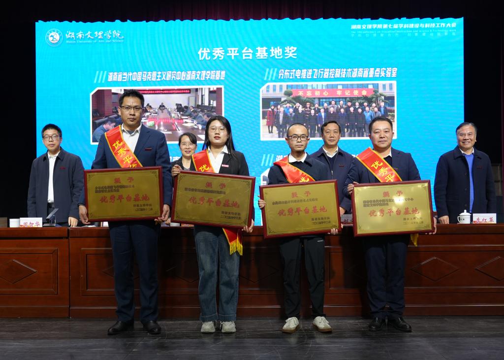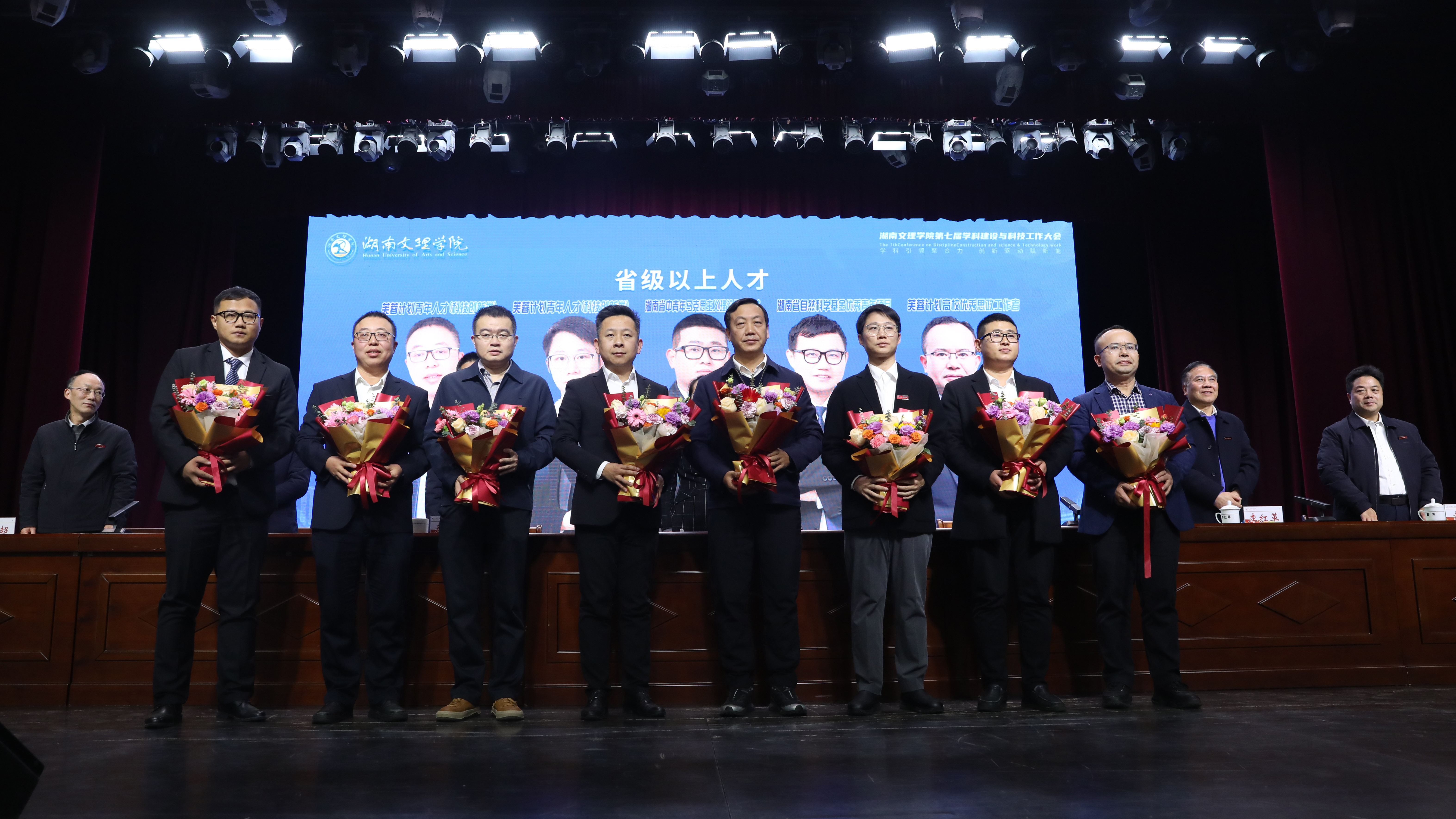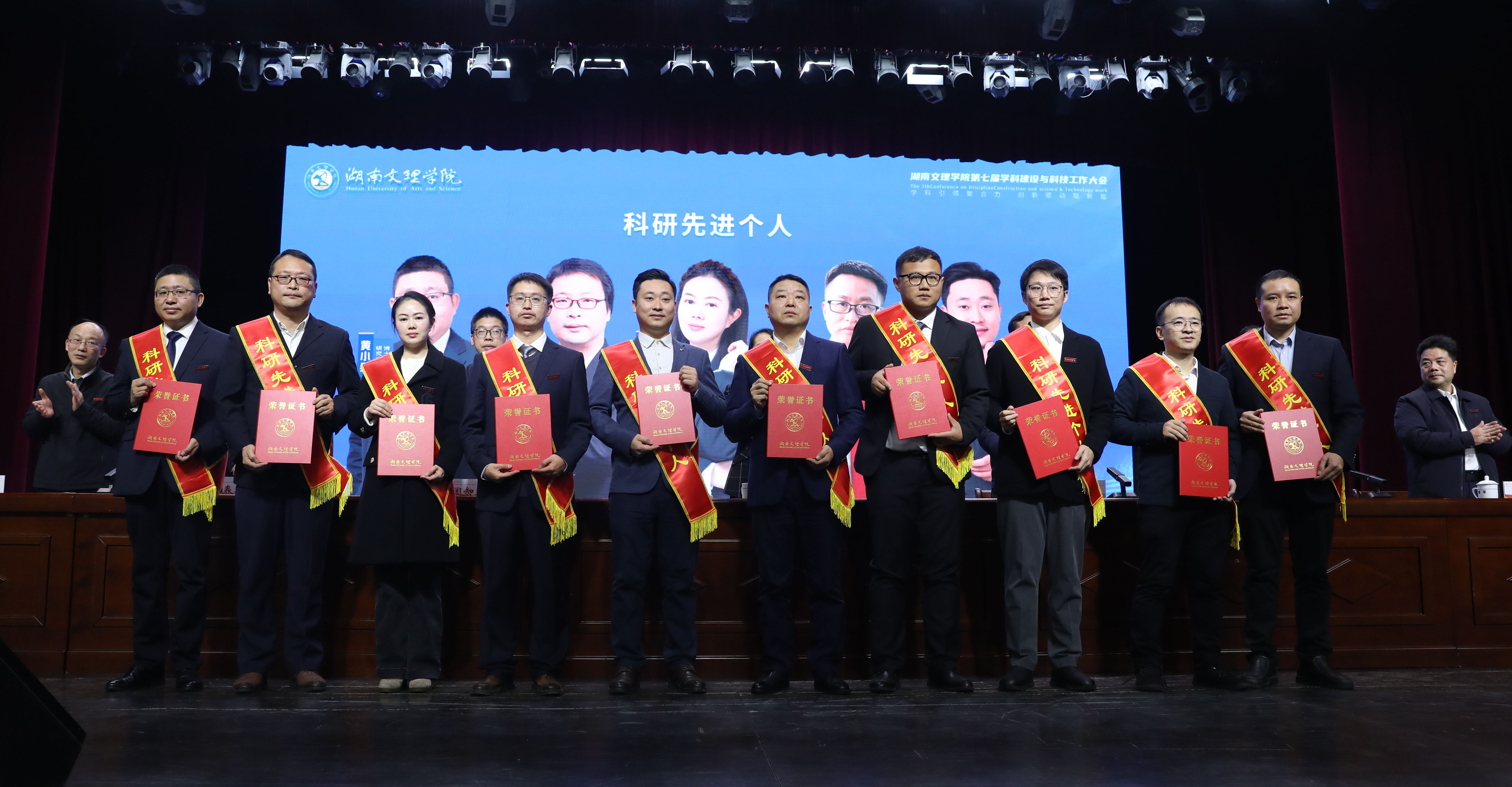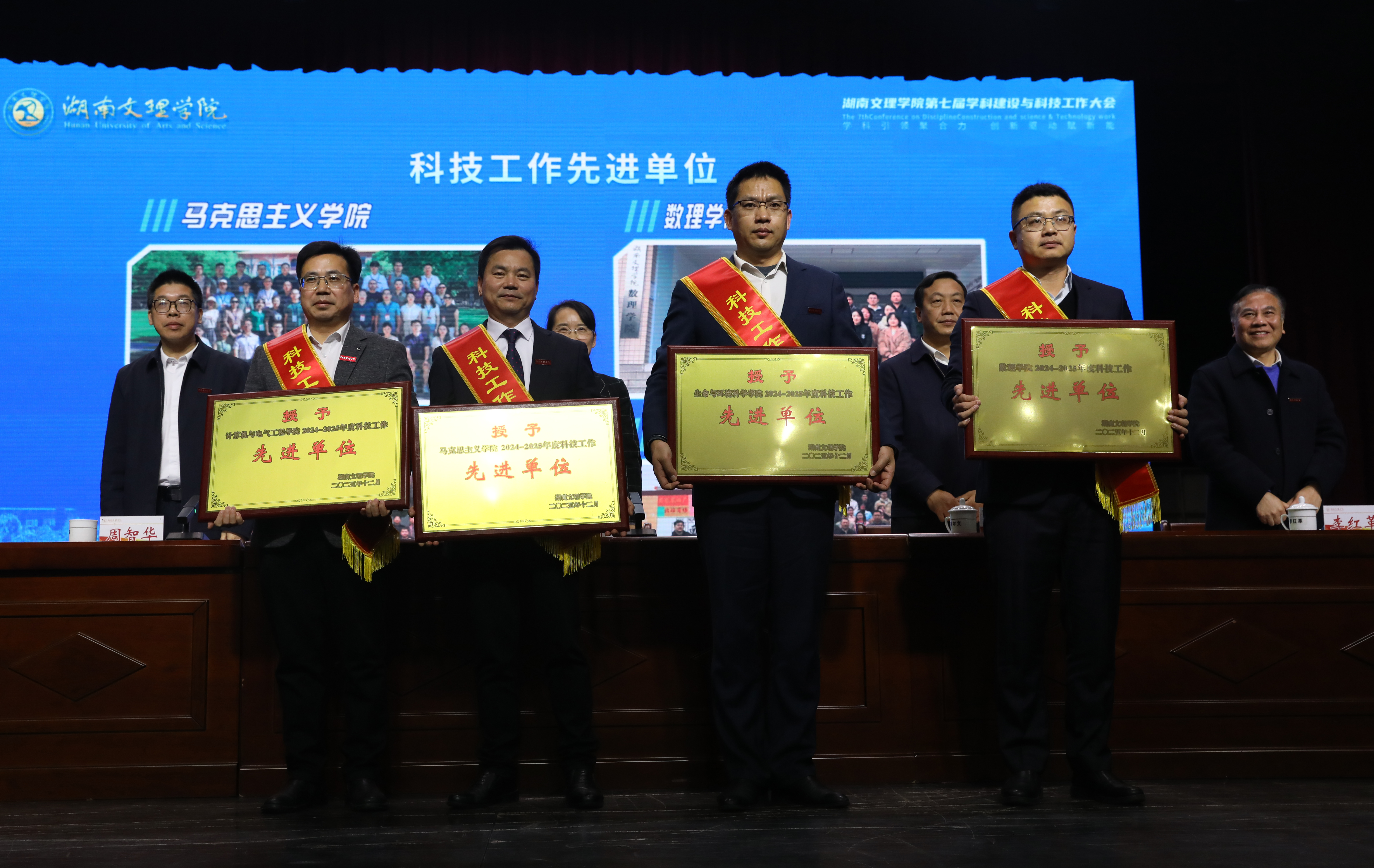 李红革宣读学校表彰决定,马克思主义学院等4个学院获评“科技工作先进单位”,应用经济学学科团队等2个团队获评“优秀学科团队”,湖南省当代中国马克思主义研究中心湖南文理学院基地等4个基地获评“优秀平台基地”,董树军等5名教师获评“科研标兵”,黄小兵等10名教师获评“科研先进个人”,肖安国等2名教师的科研成果获评“标志性成果奖”。会上还公布了学校2024-2025年新增省级以上人才称号。之后,主席台领导为获奖单位和个人颁奖。数理学院院长蔡剑华、化学与材料工程学院副教授张智、音乐舞蹈学院副院长曾娜妮先后代表科技工作先进单位、科研标兵、科研先进个人代表在会上发言。